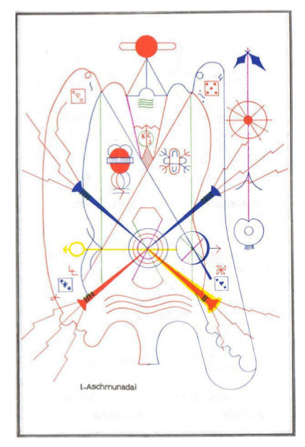 The Sigil below is described in Bardon’s “The Practice of Ceremonial Evocation” this way: Fig. 1: Aschmunadai – is a powerful initiate in the zone girdling the earth. He has the rank of an absolute monarch. His universal seal, as shown in picture 1, is very complicated, but is a graphical representation of all the fundamental qualities with which this high intelligence is equipped with regard to the zone girdling the earth and also with regard to our physical world.